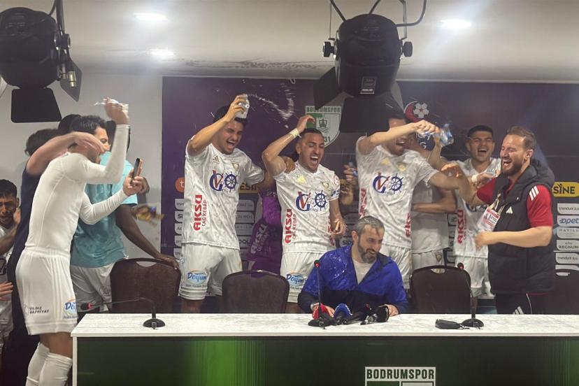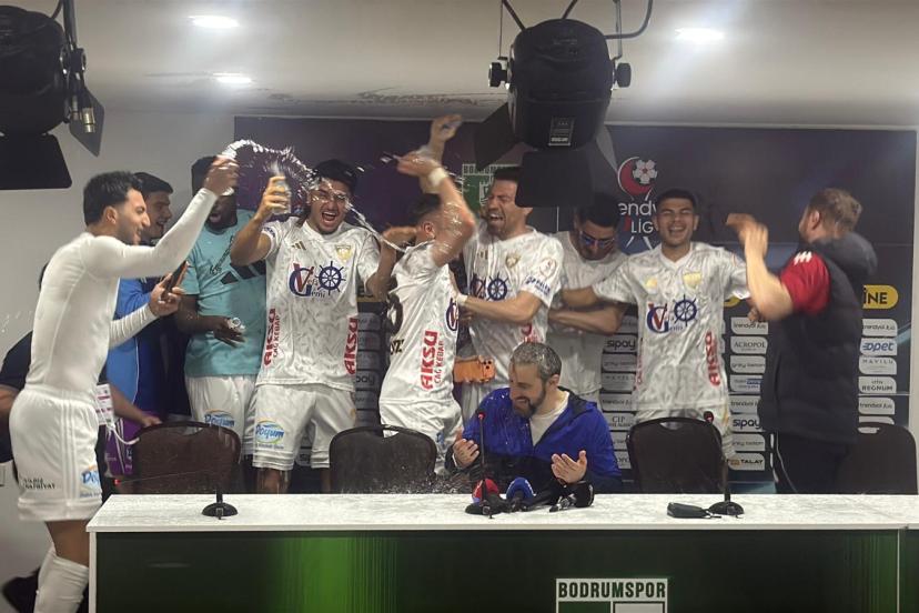 1’inci Lig’de Bodrum FK ile deplasmanda 1-1 berabere kalarak bitime 2 hafta kala 5 yıl sonra Süper Lig’e yükselmeyi garantileyen Erzurumspor’da, karşılaşma sonrası düzenlenen basın toplantısında teknik direktör Serkan Özbalta’ya futbolcularından sürpriz geldi. Toplantı sırasında içeri giren Erzurumsporlu futbolcular, gelenek gereği Özbalta’yı su şişeleriyle ıslatarak şampiyonluğu birlikte kutladı. Tecrübeli teknik adam, bu sürprizin ardından basın toplantısına yeniden başladı.